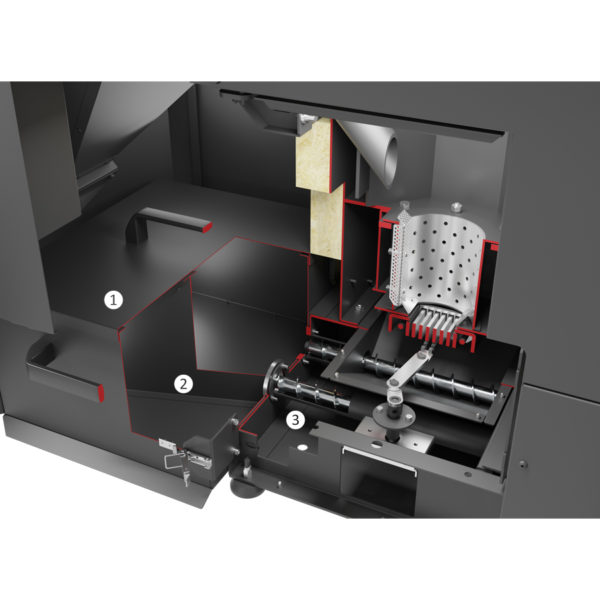 - Förderschnecke und Auffangkammer für die Ascheabsaugung.